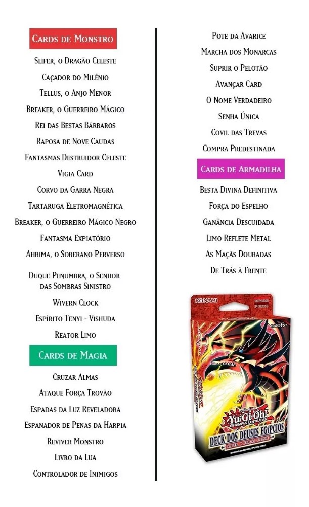 O Deck vem pronto para ser usado direto da caixa, e acompanha um Guia de Duelos que explica sua estratégia básica, além de algumas regras que você deve saber para obter máximo proveito. Claro, você pode escolher os dois para combinar suas estratégias e criar um Deck incrível capaz de dominar vários cards de Deuses Egípcios!