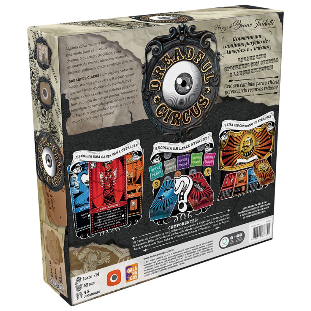 Dreadful Circus é o jogo perfeito para quem busca uma experiência de horror única. Cada jogador irá liderar um circo que viaja pelo mundo e competir com os espetáculos dos adversários. A arte e design de Dreadful Circus são uma verdadeira obra de arte que trazem a temática de horror ao jogo. Os jogadores serão imersos em um clima de mistério e tensão, enquanto se divertem criando as mais bizarras e assustadoras atrações para seus circos!