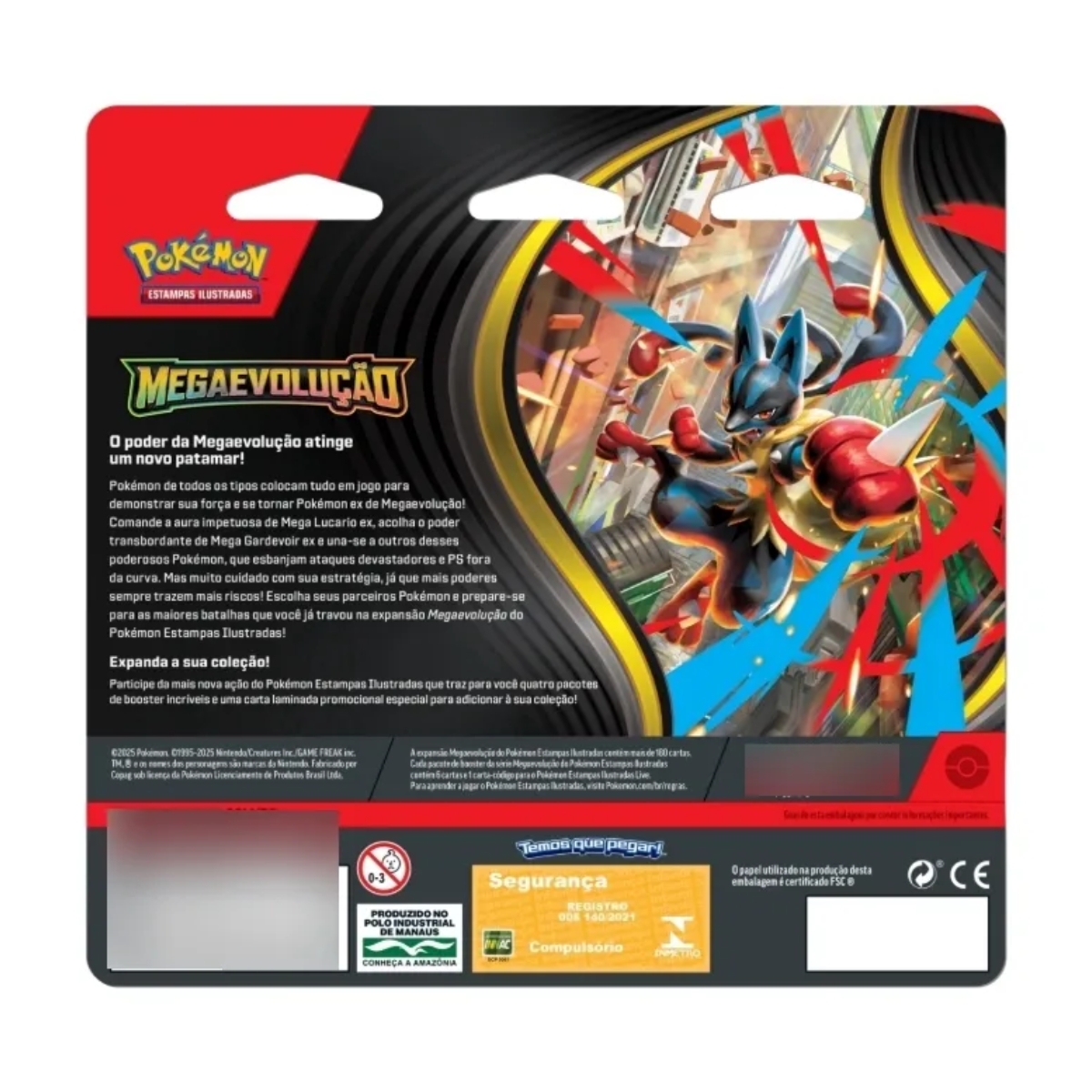 Cada blister inclui 4 boosters oficiais da coleção Mega Evolução, com 6 cartas em português cada, além de uma carta promocional holográfica do Psyduck e uma carta de código para o Pokémon Estampas Ilustradas Live.
