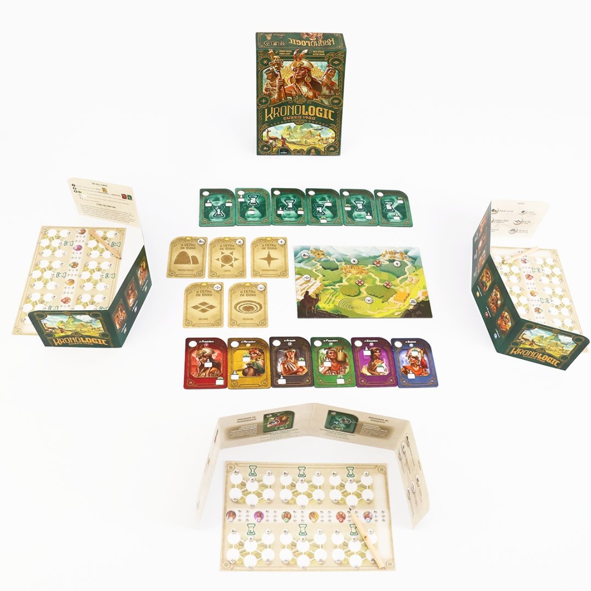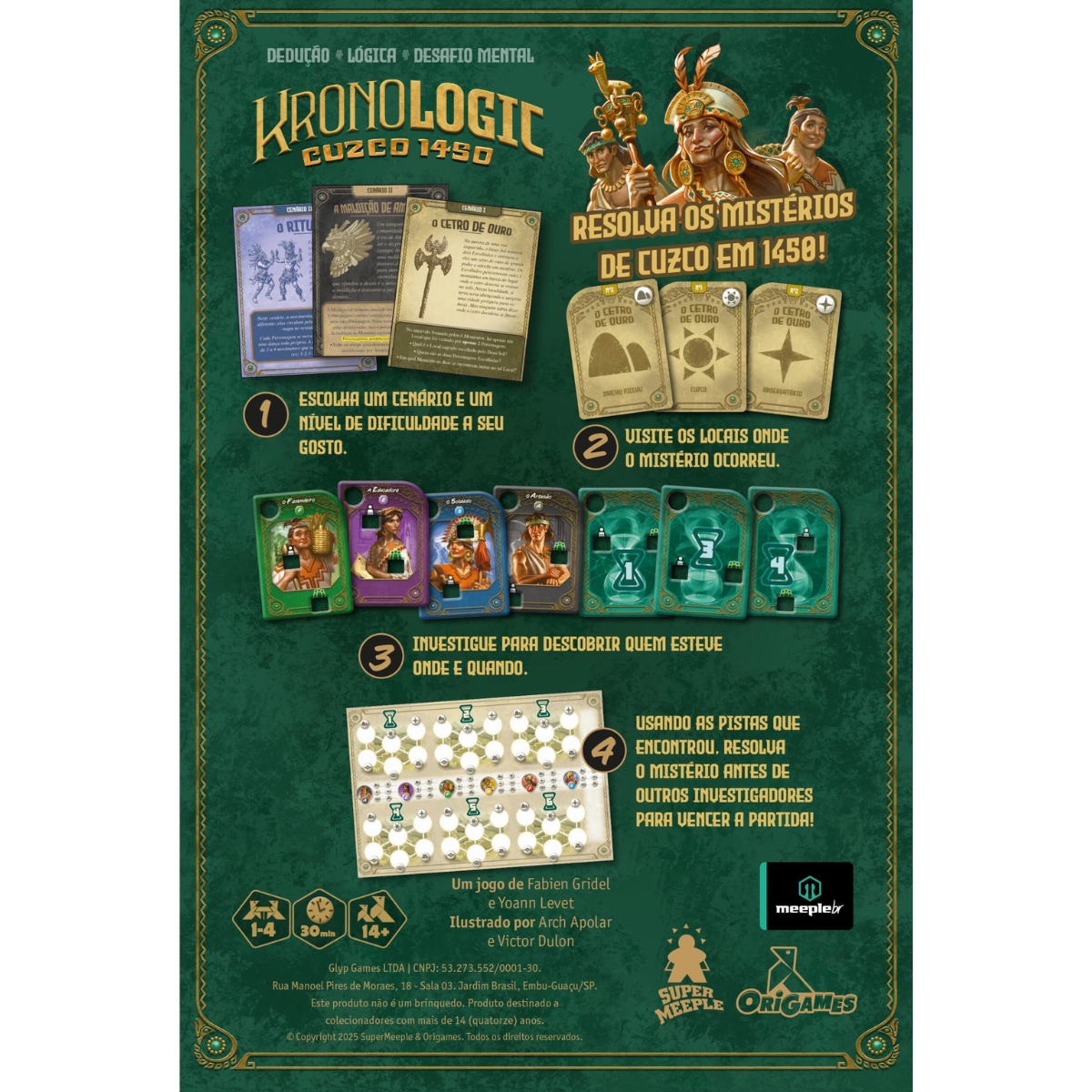 Em Kronologic: Cuzco 1450, você é transportado para as profundezas da antiga capital do Império Inca, onde um crime misterioso ameaça alterar o curso da história. Nesta nova edição da linha Kronologic, de 1 a 4 jogadores assumem o papel de detetives viajando no tempo para desvendar cinco investigações interligadas, cada uma com níveis crescentes de dificuldade.